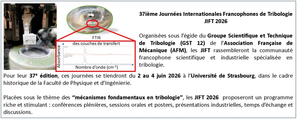 Organisées sous l’égide du Groupe Scientifique et Technique de Tribologie (GST 12) de l’Association Française de Mécanique (AFM), les JIFT rassembleront la communauté francophone scientifique et industrielle spécialisée en tribologie.